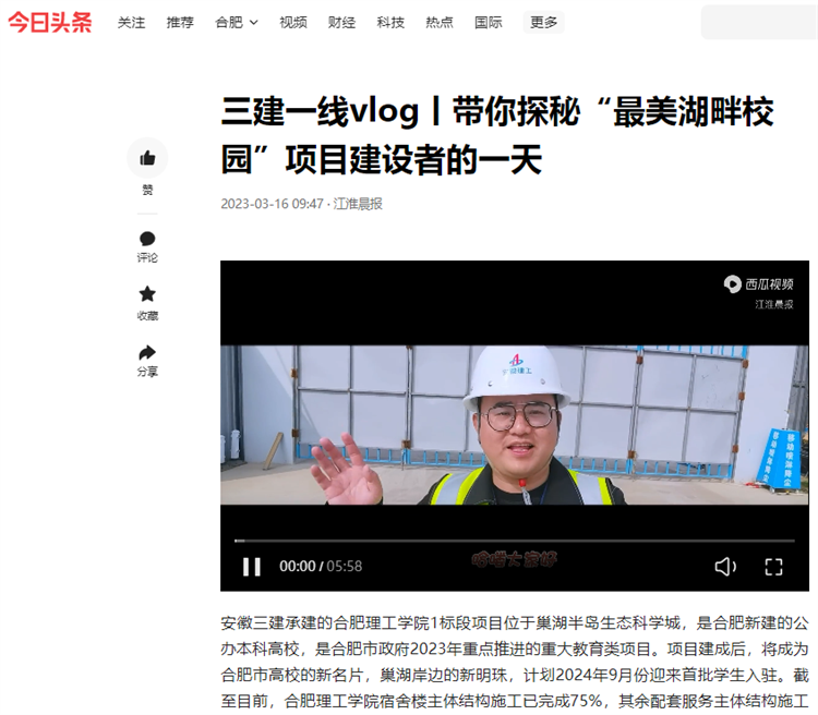 近日,學(xué)習(xí)強(qiáng)國(guó)、今日頭條、合肥晚報(bào)等主流媒體聚焦公司一線vlog,該視頻以較為新穎的vlog形式,聚焦項(xiàng)目一線管理人員工作生活動(dòng)態(tài),展現(xiàn)項(xiàng)目建設(shè)成果,受到廣泛關(guān)注。