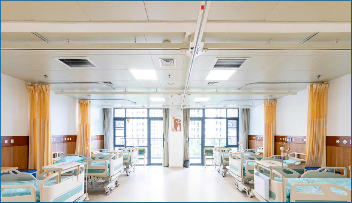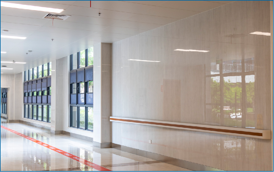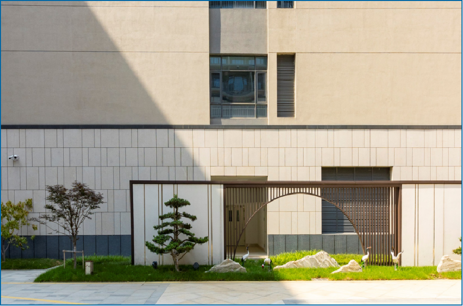 設(shè)計(jì)上,摒棄了傳統(tǒng)醫(yī)院病房樓的直通式走廊,形成類似“街道+廣場(chǎng)”的空間,成為充滿生活氛圍的社區(qū)交往空間,延續(xù)家居感覺。根據(jù)不同使用人群(失能、失智老年人、自理老人)的需求,設(shè)置不同的配套服務(wù)功能,以康養(yǎng)軸連接南、北、中部各功能模塊,利用無障礙人行通道形成風(fēng)雨無阻的步行系統(tǒng)。設(shè)置智能適老化看護(hù)管理系統(tǒng)和無障礙智能載人天軌系統(tǒng),施工策劃全面考慮運(yùn)營需求,確保系統(tǒng)平穩(wěn)運(yùn)行且無交叉、無干擾。