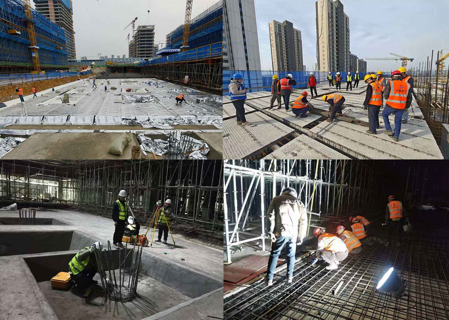 春節(jié)復(fù)工后,項目部開足馬力,緊抓C04#樓屋面吊模模板拆除及清理工作,C05#樓、B06#樓鋁模板面拼裝、混凝土澆筑,以及地庫S15段頂板模板鋪設(shè)、N4段內(nèi)架搭設(shè)、N5段頂板模板鋪設(shè),確保了工程全面進入正常施工狀態(tài)。