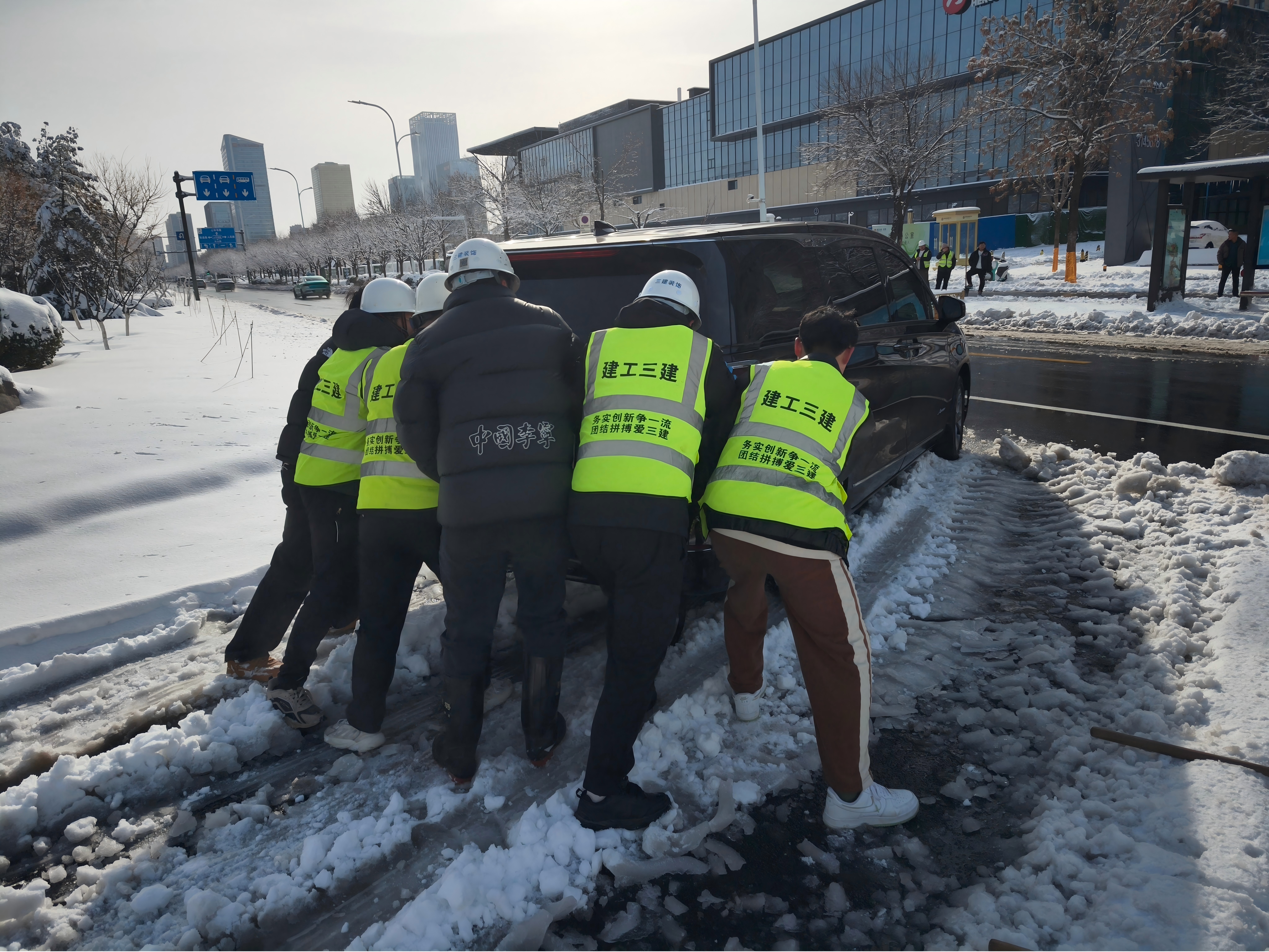 項(xiàng)目黨員同志帶領(lǐng)職工群眾不畏嚴(yán)寒,手持鐵鍬,一鏟一鏟地清理著項(xiàng)目周邊道路及工作區(qū)域的積雪,全力保障施工安全和居民正常通行。在鏟雪過(guò)程中,項(xiàng)目管理人員為協(xié)助車輛被困的路人,仔細(xì)清除車輛周圍及車輪下的積雪障礙,指揮路人緩慢駕駛,最終成功幫助車輛脫困。