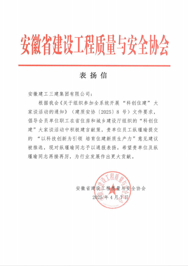 近日,安徽建工三建集團(tuán)有限公司職工黃波、縱瑾瑜因在安徽省建設(shè)工程質(zhì)量與安全協(xié)會“科創(chuàng)住建”大家談活動中提交的《關(guān)于發(fā)展智能建造和推廣應(yīng)用建筑機(jī)器人的建議》和《淺談“以科技創(chuàng)新為引領(lǐng) 培育住建新質(zhì)生產(chǎn)力”》獲通報(bào)表揚(yáng)。