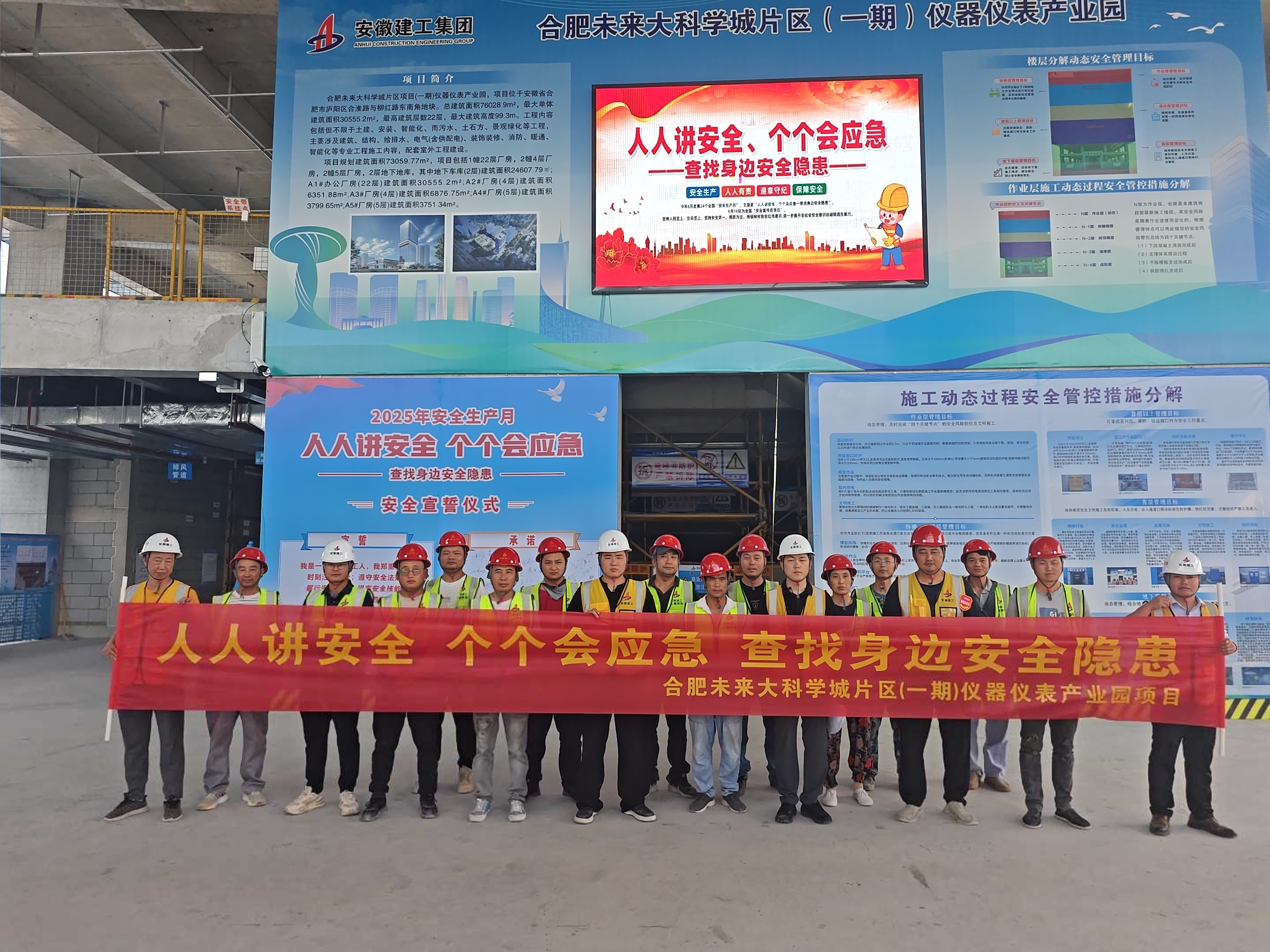 在全國(guó)第24個(gè)安全生產(chǎn)月期間,項(xiàng)目團(tuán)隊(duì)打出“安全+質(zhì)量”組合拳,緊扣“人人講安全、個(gè)個(gè)會(huì)應(yīng)急—查找身邊安全隱患”的“安全生產(chǎn)月”主題,多維度筑牢安全防線。通過(guò)懸掛安全標(biāo)語(yǔ)、發(fā)放安全宣傳單、組織全員觀看警示教育視頻等方式強(qiáng)化全員安全意識(shí)。每日召開(kāi)安全晨會(huì),全面排查施工風(fēng)險(xiǎn)點(diǎn),常態(tài)化開(kāi)展安全技術(shù)交底與培訓(xùn),切實(shí)推動(dòng)安全意識(shí)深入人心。此外,項(xiàng)目管理人員實(shí)行24小時(shí)輪班值守,既當(dāng)“安全哨兵”,又做“質(zhì)量尖兵”。這種“白+黑”的堅(jiān)守,換來(lái)的是A-3#樓提前30天封頂?shù)牧裂鄢煽?jī),為后續(xù)施工贏得寶貴時(shí)間。